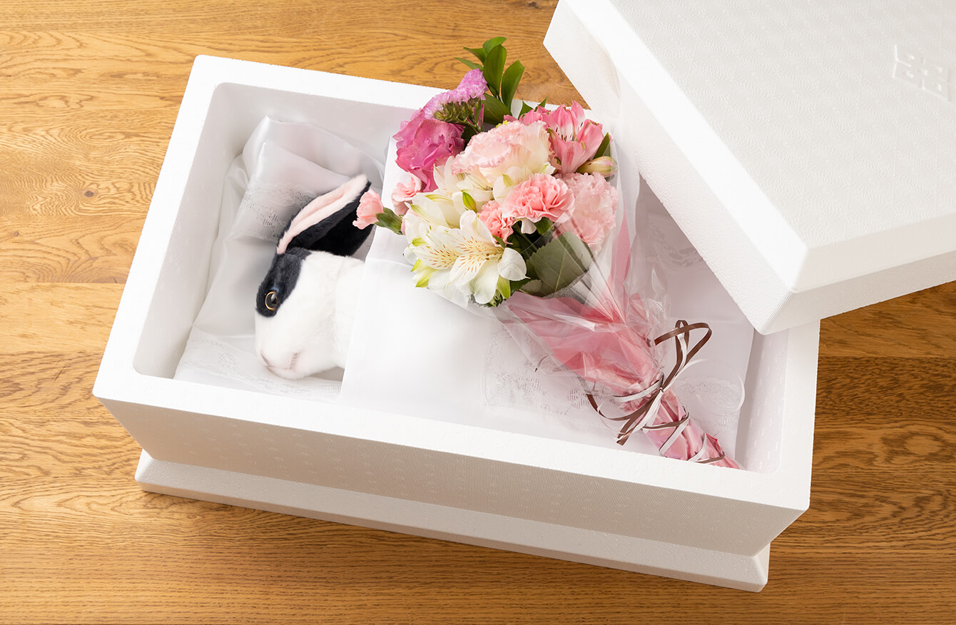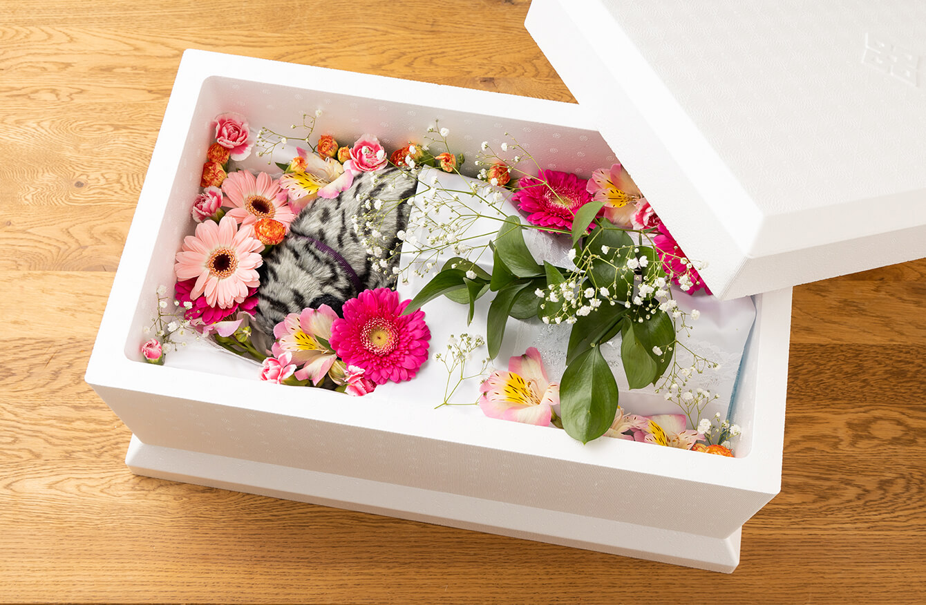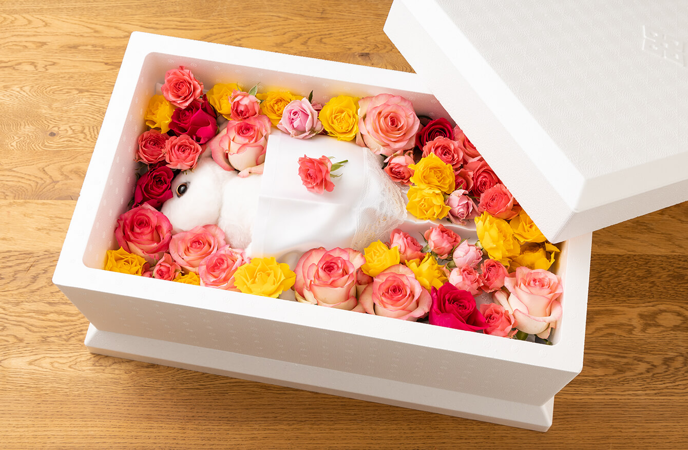 ハナミズキのペット棺は発泡素材。灰が残らないため、ペットちゃんをご家族様、ご友人、みんなの想いを込めた花できれいに飾ってあげたまま送り出せます。